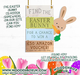 - Every correct answer to where the Easter Bunny is hiding on the WoodenBox UK website, e-mailed through to sales@woodenboxuk.com will be entered into the prize draw for the £50 Amazon Voucher.